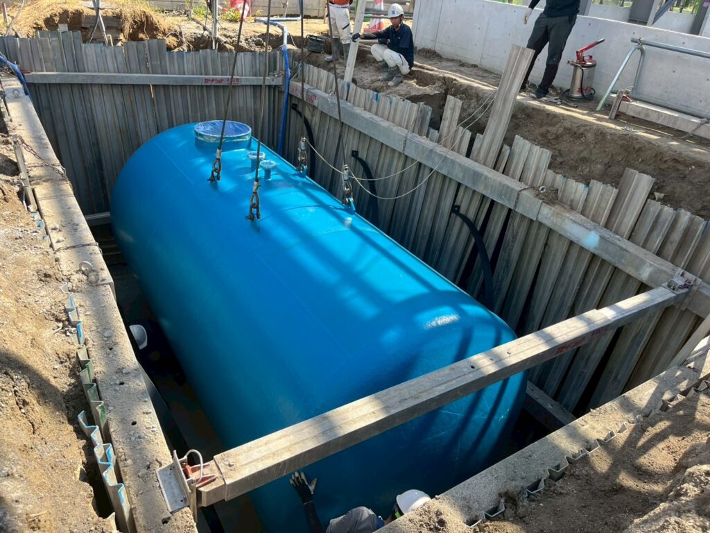 周囲の土砂崩れを防ぐ土留めを設置し、掘削後にクレーンで水槽を設置し、埋め戻して完成!