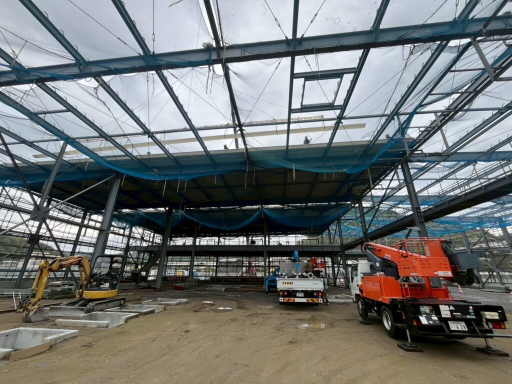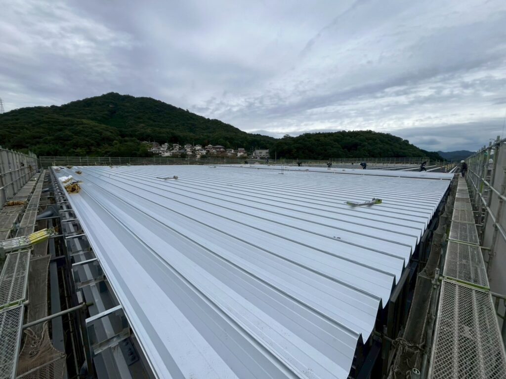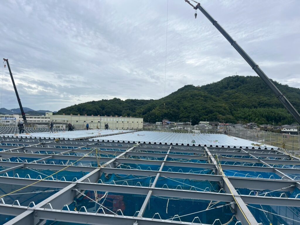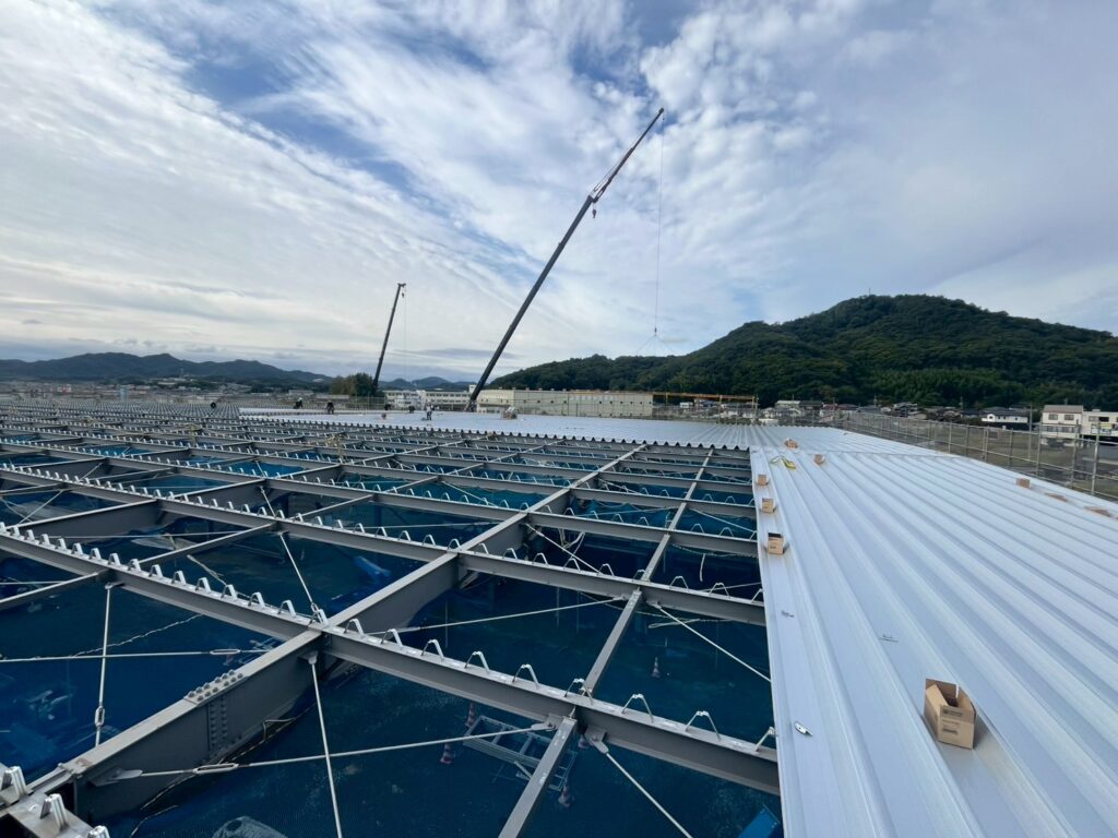 S社さま大型製造工場建設現場レポート 屋根葺き工事完了[岡山工場倉庫建築]