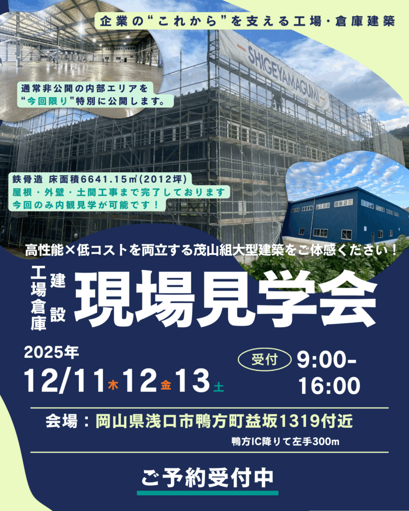 この度、こちらの工場建築現場にて見学会を開催いたします。