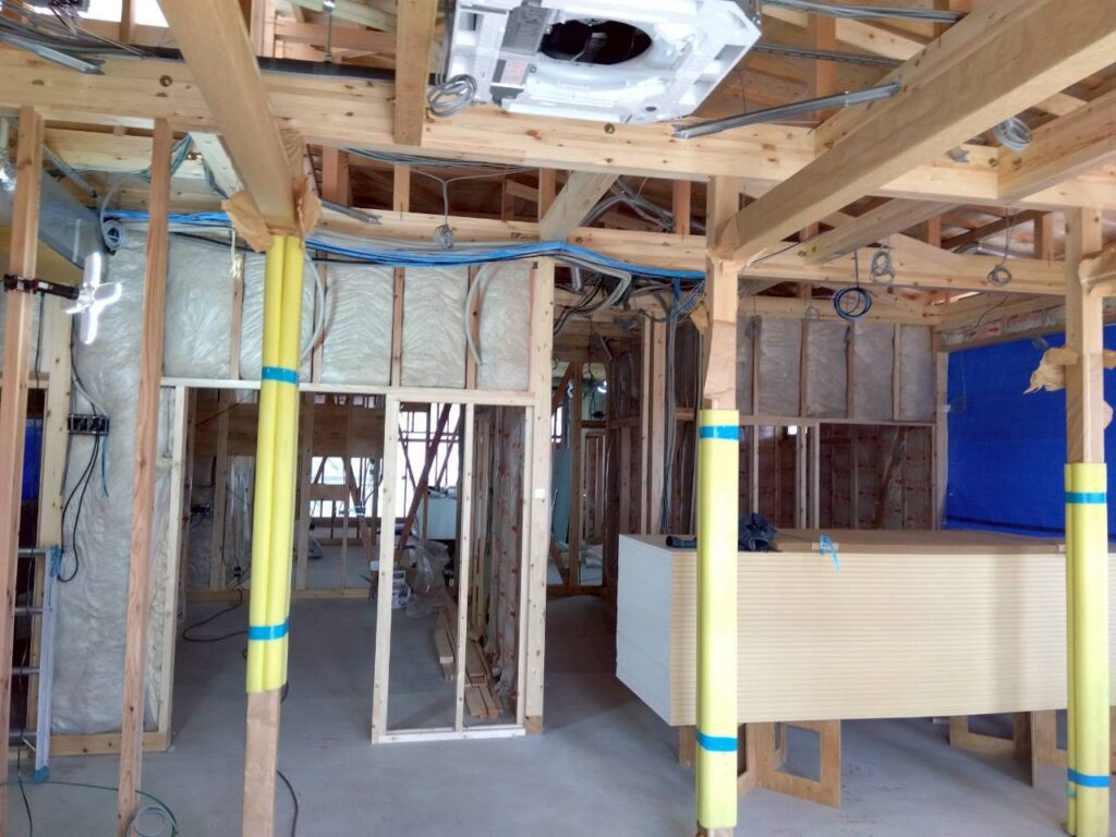 内部では、壁・天井の下地組みを行い、石膏ボード下地貼りが進んでいます。各診察室や待合スペースなど、クリニックとしての空間構成が少しずつ形になってきました。外部では外壁下地を設け、仕上げ工事に向けた準備を進めています。