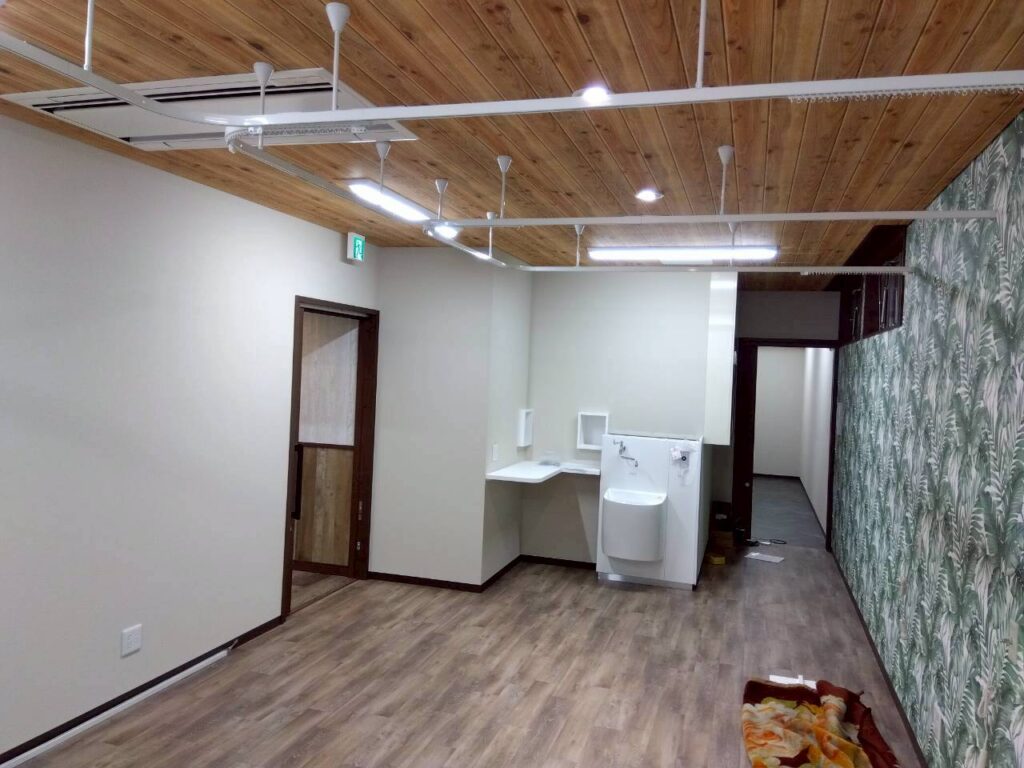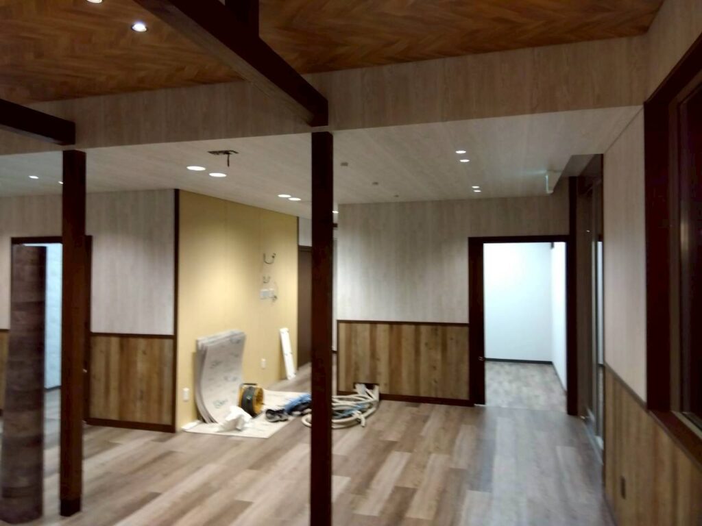 天井や壁の仕上げが進み、空間の印象がはっきりと感じられるようになってきました。木目の天井とやわらかな色合いの床材が調和し、落ち着きのある温かい雰囲気に仕上がっています。
