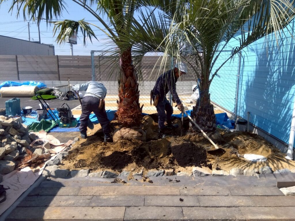 現場ではヤシの木の植栽も行われ、南国らしい雰囲気が一気に高まってきました。アプローチや植栽スペースの施工も進み、建物と外構が一体となった、開放感のある空間が少しずつ形になっています。