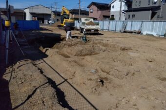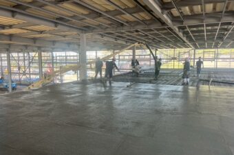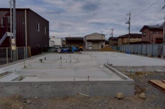 基礎工事の基盤を整えるためにコンクリートを薄く均一に流して