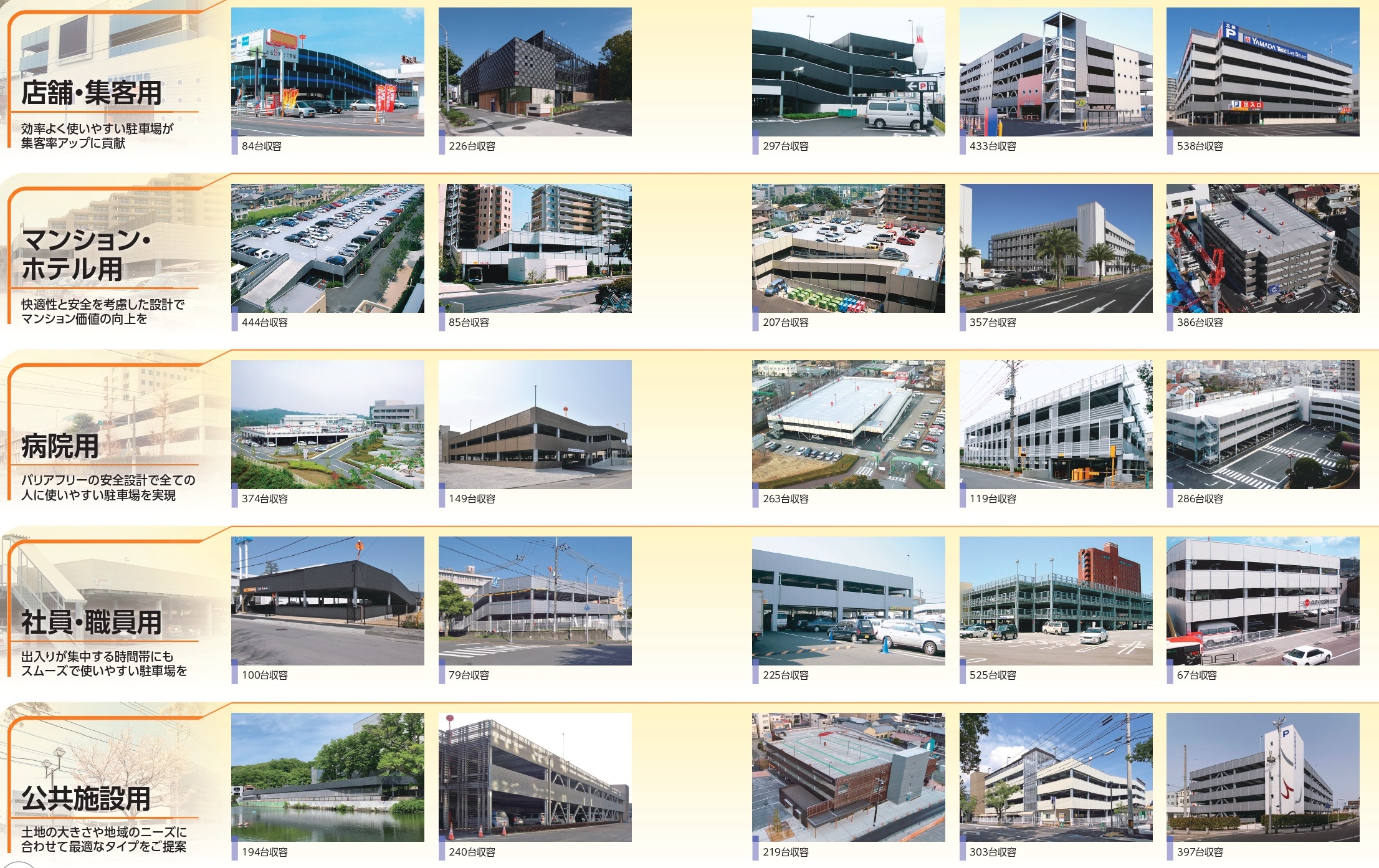 郊外のショッピングセンターや駅前の集客用駐車場だけでなく、社員用の駐車場、マンション住人やホテル利用者の駐車場、大学や病院などの公共施設など様々な用途で使用できるラインナップがございます。